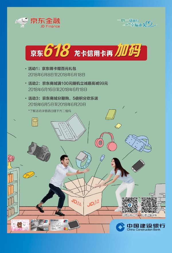 绑定龙卡信用卡,即可获得新客百元礼包!2018年6月8日至6月18日期间,持卡人通过指定入口首次在京东商城一键绑定龙卡信用卡,即可得到价值100元的京东权益大礼包。*每天限量5000名,同一持卡人仅限参与一次。100元权益大礼包包含:10元新客建行支付券1张和90元京东优惠券包(含全品类京东券1张、指定品牌优惠券3张)