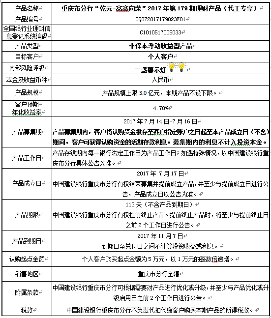 本产品为非保本浮动收益型理财产品,不保证本金和收益,请您充分认识投资风险,谨慎投资。本期产品期限为113天(中国建设银行有权对产品进行展期或提前终止),存续期内,产品不接受申购或赎回申请。本期产品内部风险评级级别为二盏警示灯,风险水平属于较低风险。最不利情况下,您将损失全部收益甚至包括全部本金。本理财产品适用于收益型、稳健型、进取型 、积极进取型客户。