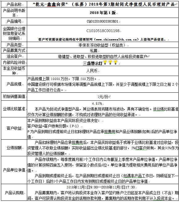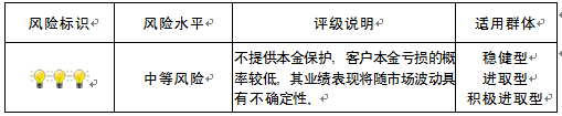 本产品为封闭式净值型理财产品,不保证本金和收益,请您充分认识投资风险,谨慎投资。本产品任何业绩比较基准、测算收益或类似表述均属不具有法律约束力的用语,不代表客户可能获得的实际收益,亦不构成中国建设银行重庆市分行对本产品的任何收益承诺。产品期限为固定期限(中国建设银行重庆市分行有权提前终止产品),存续期内产品不接受赎回申请。 本期产品内部风险评级级别为三盏警示灯 ,风险程度属于中等风险,适用于稳健型、进取型和积极进取型客户。最不利情况下,本期产品投资的资产无法回收任何本金和净收益,客户将损失全部本金。投资者不得使用贷款、发行债券等筹集的非自有资金投资本产品。如影响您风险承受能力的因素发生变化,请及时完成风险承受能力评估。