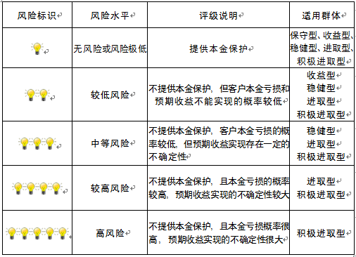 本产品为非保本浮动收益型理财产品,不保证本金和收益,请您充分认识投资风险,谨慎投资。本期产品期限为185天(中国建设银行有权对产品进行展期或提前终止),存续期内,产品不接受申购或赎回申请。本期产品内部风险评级级别为三盏警示灯,风险水平属于中等风险。最不利情况下,您将损失全部收益甚至包括全部本金。本理财产品适用于稳健型、进取型 、积极进取型客户。