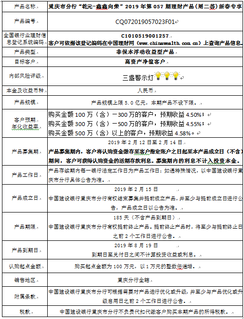 3.中国建设银行重庆市分行可根据市场情况等调整产品规模上、下限,并最迟于调整规模上下限当日进行公告。