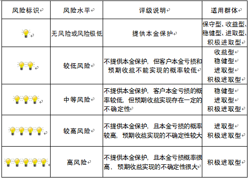 本产品为非保本浮动收益型理财产品,不保证本金和收益,请您充分认识投资风险,谨慎投资。本期产品期限为90天(中国建设银行有权对产品进行展期或提前终止),存续期内,产品不接受申购或赎回申请。本期产品内部风险评级级别为二盏警示灯 ,风险水平属于较低风险。最不利情况下,您将损失全部收益甚至包括全部本金。本理财产品适用于收益型、稳健型、进取型 、积极进取型客户。