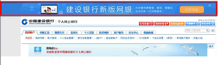 自3月27日起,我行面向全国客户诚邀体验,您可点击现有网银上方邀请链接抢先体验新版网银。