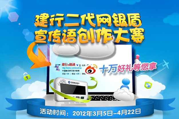 近期,中国建设银行通过新浪官方微博“建行e路通”(http://weibo.com/elutong)开展了以“建行二代网银盾宣传语创作大赛”为主题的大型营销活动。