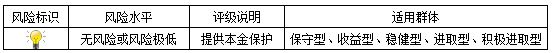 本期产品为保本浮动收益型理财产品,本理财产品有投资风险,只保障理财资金本金,不保证理财收益,您应当充分认识投资风险,谨慎投资。本期产品期限为90天(中国建设银行有权对产品进行展期或提前终止)。本期产品内部风险评级级别为一盏警示灯,风险程度属于无风险或风险极低,适用于保守型、收益型、稳健型、进取型及积极进取型投资者。最不利情况下,客户只能收回投资本金,不能获得任何投资收益。