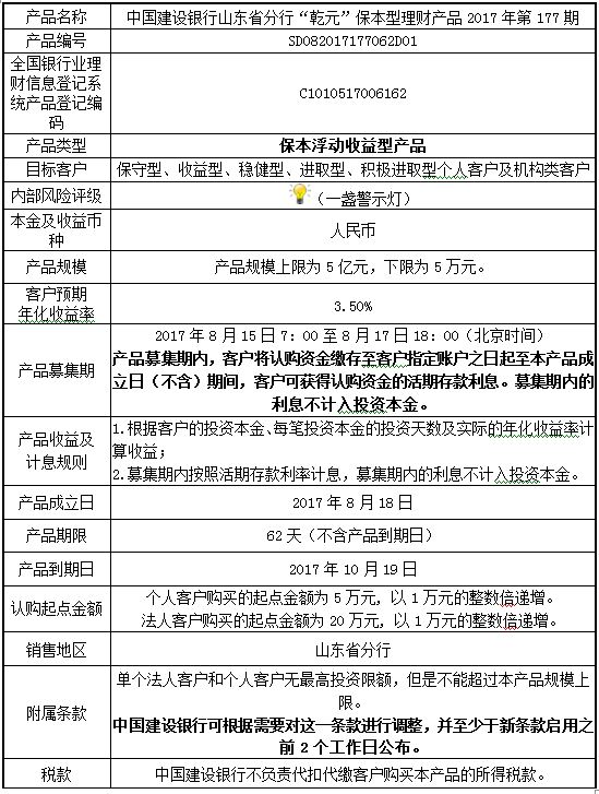 2.本产品规模下限:5万元。在本期产品募集期内,对本期产品的认购金额未能达到本期理财产品规模下限,中国建设银行有权利但无义务宣布本期产品不成立。如产品不成立,中国建设银行将在通知客户产品不成立后5个工作日内返还客户已缴纳的认购本金至客户指定账户,客户应确保账户状态正常,并及时查询账户资金变动情况。