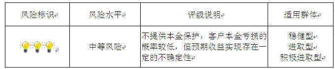 本期产品为非保本浮动收益型理财产品,不保证本金和收益,请您充分认识投资风险,谨慎投资。本期产品期限139天(中国建设银行有权对本期产品进行展期和提前终止),存续期内产品不接受申购或赎回申请。本期产品内部风险评级级别为3盏警示灯 ,风险程度属于中等风险。最不利情况下,资产组合无法回收任何本金和净收益,客户将损失全部本金。产品适合于稳健型、进取型及积极进取型客户。