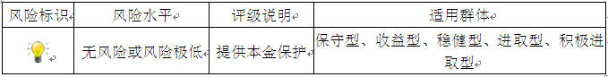 本期产品为保本浮动收益型理财产品,本理财产品有投资风险,只保障理财资金本金,不保证理财收益,您应当充分认识投资风险,谨慎投资。本期产品期限为118天(中国建设银行有权对产品进行展期或提前终止)。本期产品内部风险评级级别为一盏警示灯,风险程度属于无风险或风险极低,适用于保守型、收益型、稳健型、进取型及积极进取型投资者。最不利情况下,客户只能收回投资本金,不能获得任何投资收益。