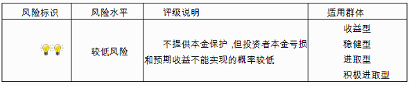 本期产品为非保本浮动收益型理财产品,不保证本金和收益,请您充分认识投资风险,谨慎投资。本期产品期限43天(中国建设银行有权对本期产品进行展期和提前终止),存续期内产品不接受申购或赎回申请。本期产品内部风险评级级别为两盏警示灯 ,风险程度属于较低风险。最不利情况下,资产组合无法回收任何本金和净收益,客户将损失全部本金。产品适合于收益型、稳健型、进取型及积极进取型客户。