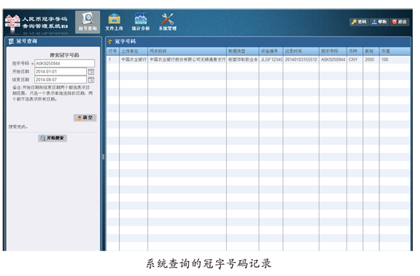 通过记录、存储、备查银行业金融机构对外付出人民币冠字号码(100元券和50元券),可以解决银行涉假币纠纷的举证和责任认定问题,维护金融消费者权益。金融消费者在银行办理现金取款业务后,对现金真伪存在异议,经银行进行真伪识别确认是假币的,假币将会被银行收缴。金融消费者可以凭借收缴凭证向银行提起冠字号码查询申请,由银行查证,如果该假币由银行付出,金融消费者将得到全额赔偿。
