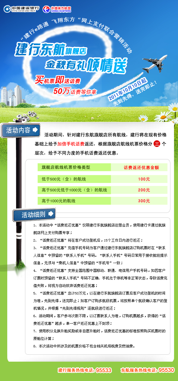 建行东航旗舰店 ,金秋有礼倾情送——买机票即送话费,50万话费等你拿!