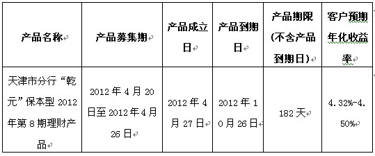 尊敬的客户: 天津市分行“乾元”保本型理财产品2012年第8期现已正式发行,敬请广大新老客户购买。