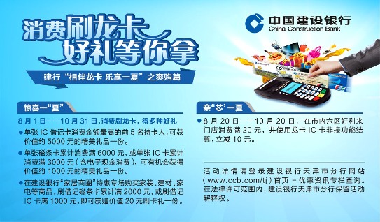 3.活动期间,客户参与建设银行举办的家居商圈(即:家装、建材、家电等)专场特惠活动,并成功购买商品,刷我行借记卡累计2000元(含)以上,借记IC1000元(含)以上,额外获赠价值20元刷卡礼一份。活动期间共设礼品3000份,赠完为止。