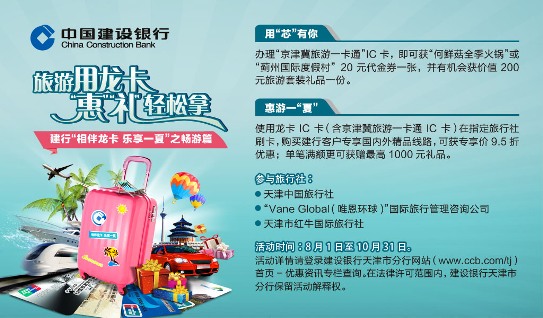 2.凡持建设银行龙卡IC卡或京津冀旅游一卡通IC卡在指定旅行社单笔刷卡金额: