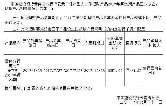 中国建设银行云南省分行“乾元”保本型人民币理财产品2017年第23期成立公告